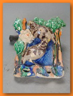 在追溯石灣藝術陶瓷的源流時,我們很多時會想到河宕遺址的印紋陶或者瀾石的古墓葬出土的陪葬物,但這不應該成為石灣藝術陶的真正源流。正如陶器的出現,世界各地是不需要互相學習而自發產生的。印紋陶和漢墓葬在全國范圍內許多地方都有出現,在石灣及周邊地區出土的陶器并未顯露出后來石灣窯藝術陶瓷的明顯特征,只可以說明石灣地區開始有人做陶,隱含了制陶的基因。石灣藝術陶瓷真正起源于明代,這是得到眾多文化學者的認同。在藝術陶的五大種類中,較早出現的是藝術器皿。明代蘇可松的《翠毛釉貫耳瓶》是現今保存較好的有作者姓名,年代確切的作品。根據記載,明代陳粵彩、楊升、揚名都是擅于制作器皿的名家,雖然沒有見到過他們作品的存世品,但他們的名字能流傳下來,作品也不是一般的日用器。“陳粵彩經常使用醬黃釉、綠釉等制作器物,作品較為細致整齊”,“楊名傳世器多仿古銅器,精制黑釉,常用黑白兩種釉色,簡潔樸素”,“楊升作品多仿漢代銅器式樣,擅長粉藍色釉”。這些明代的陶藝名家做的已不是一般的日用陶器,在造形和施釉方面都有一定追求的工藝美術品,作品因廣受歡迎和珍惜才會使作者留名后世。從清代大量生產的日用器皿,有不少看到藝術陶器的影子。如白釉行(古石灣陶業行會之一)的飯豉(罐),用于從廚房的大鐵鍋里盛飯到飯廳的容器,上面有浮雕龍、雞等圖案裝飾,還覆蓋了漂亮的黃釉或綠釉;花盆行(古石灣陶業行會之一)的藥酒壺(高約80~90厘米),以龍頭作壺嘴,梅花或竹裝飾壺耳;掛在墻上的掛壁,裝飾以動植物的造型,中空又可盛水養植物。總之,石灣生產的陶瓷制品中既實用又美觀的比比皆是。石灣日用陶瓷的生產始于唐宋,到明清達到鼎盛。隨著銷售的暢旺、見識的增加,將日用陶器做得更精美,提高其附加值,這是石灣制陶者和商家很易會想到的,日用陶器的造型也從簡單到復雜,釉色從單調到豐富,從而促使石灣藝術器皿的產生和成熟。